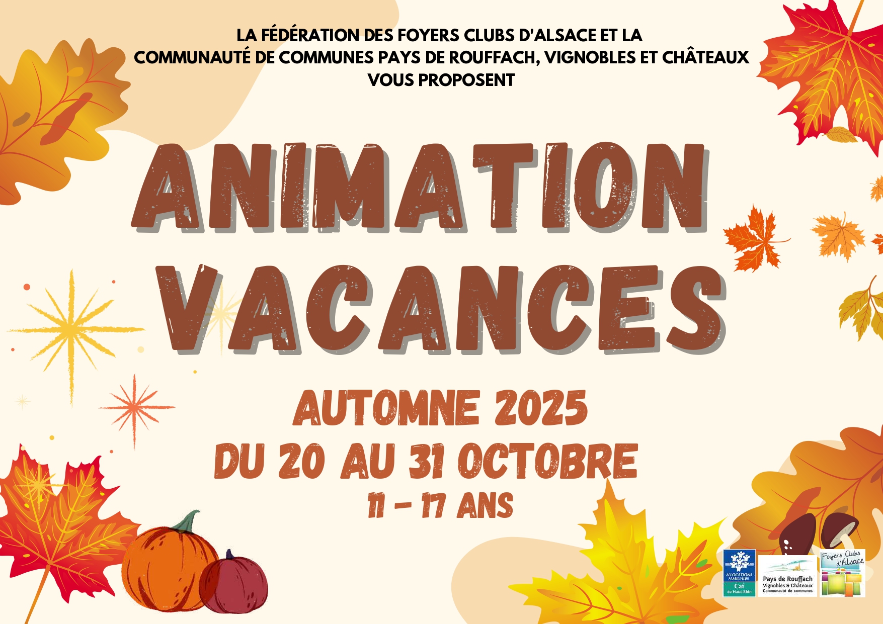 L'Espace Jeunesse de la Fédération des Foyers Clubs d'Alsace, sur le secteur de la CC PAROVIC, a le plaisir de vous présenter la programmation des animations pour les vacances d'automne 2025 !🍁